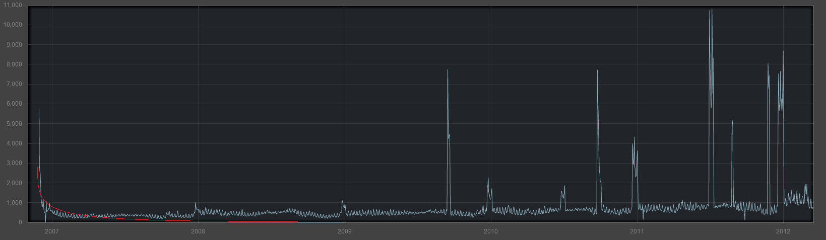 Graph showing Garry's Mod sales on the Steam service. The largest spikes are caused by Steam sales and promotions.[111]